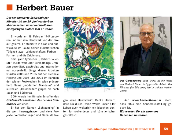 Ein wertschätzender Nachruf für den Schladminger Künstler Herbert Bauer findet sich in den Schladminger Stadtnachrichten, Ausgabe 2025-3. Der Dank gilt Frau Mag. Alexandra Schmidt und der Stadtgemeinde Schladming für die Würdigung.